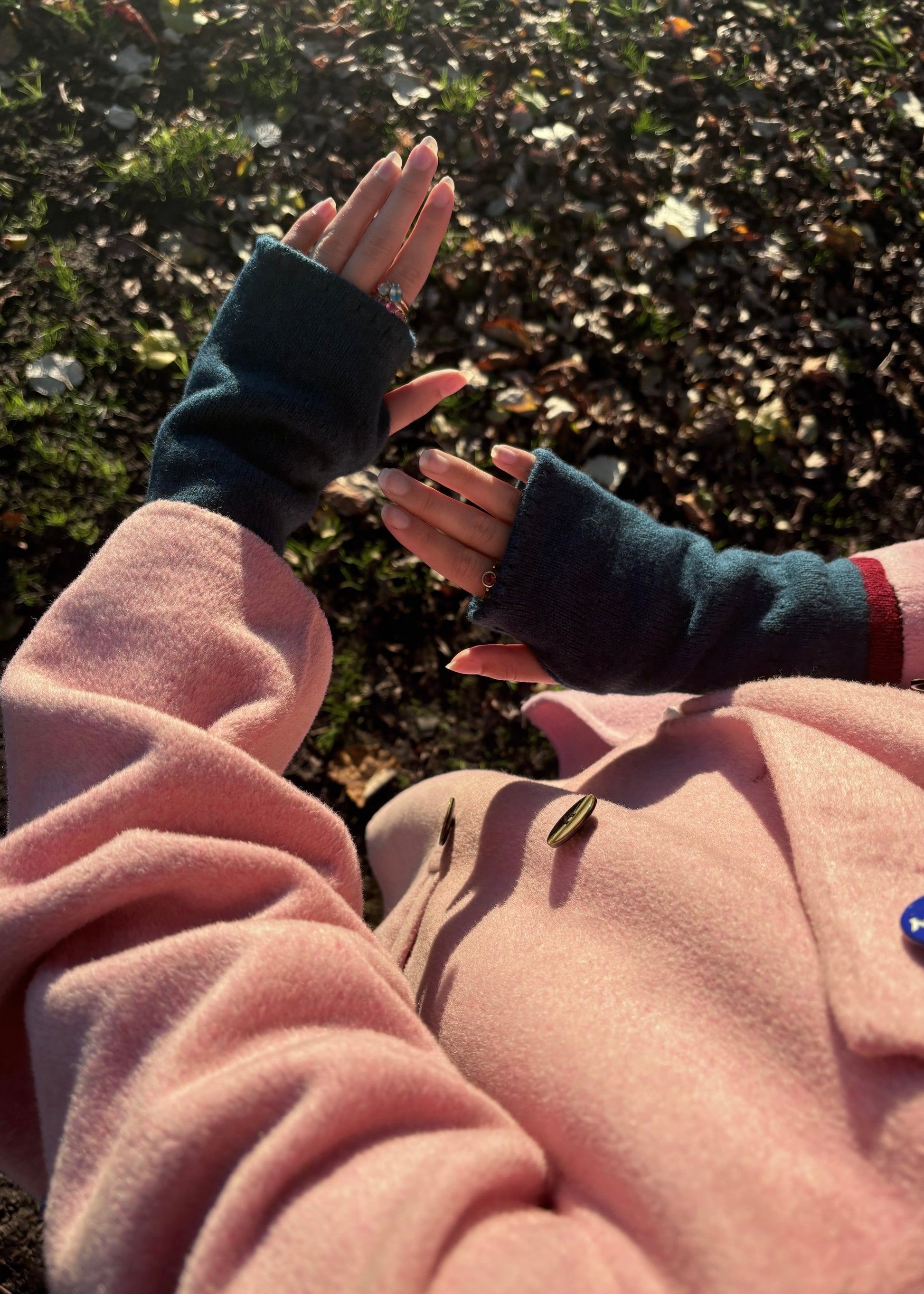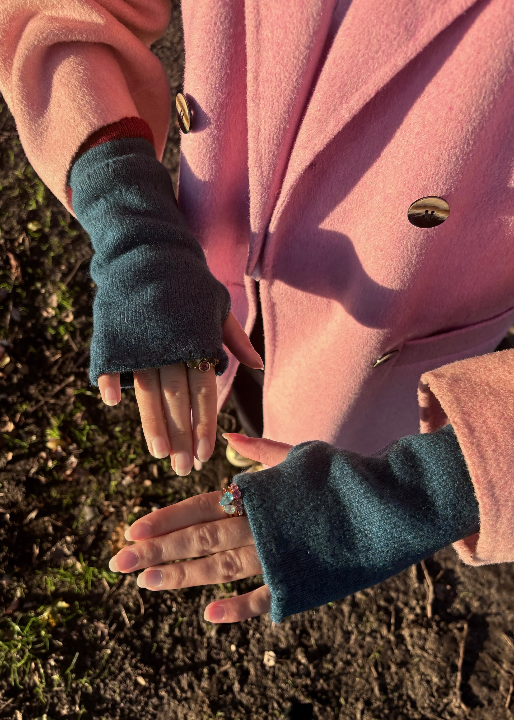 Introducing the handmade knitted wrist warmers. Made from recycled cashmere and deadstock lambswool in colour blue and red