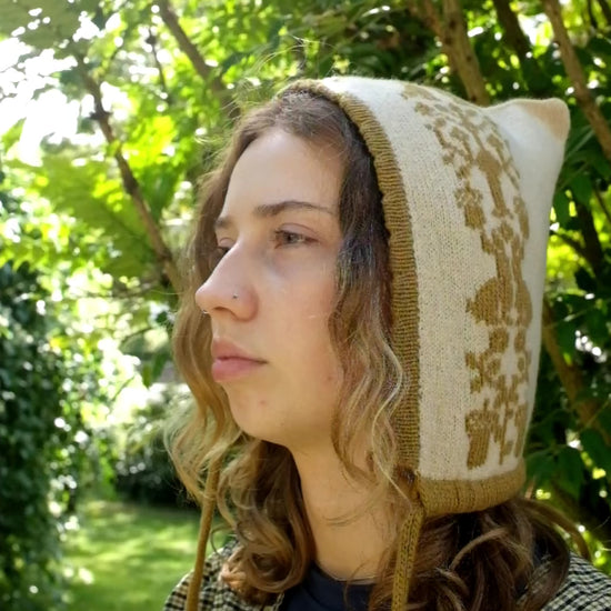 Cashmere Knitted Bonnet - “Queen of Pentacles” Pixie Hood in Golden Olive