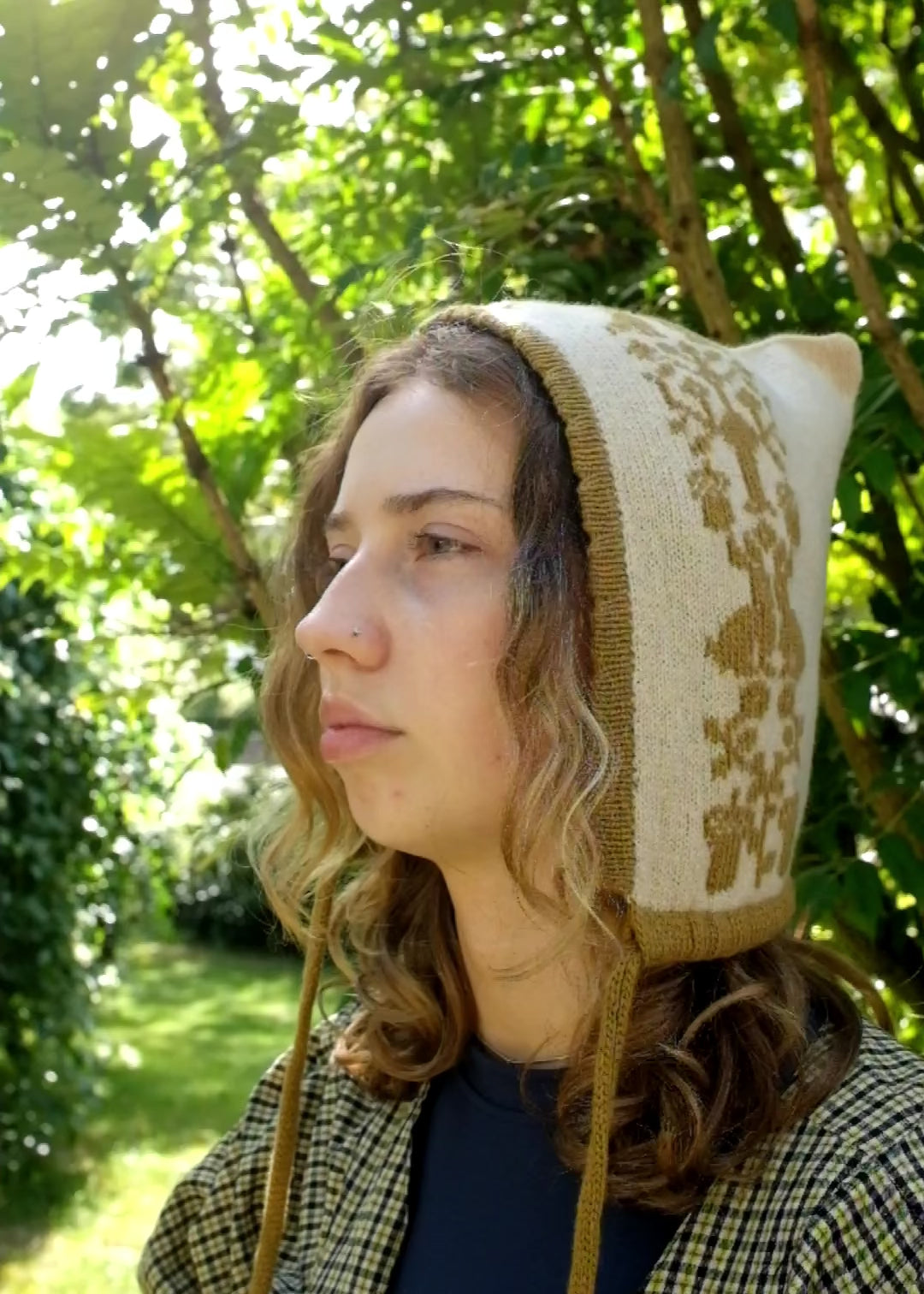 Cottage core “Queen of Pentacles”, Cashmere and Lambswool hand knitted sustainable bonnet. This hand-crafted cashmere pixie hood is machine knitted on a vintage hand powered knitting machine. All the finishing is done by hand. Available in a Golden Olive or Plum. Inspired by tarot reading i have started a business, this card reoccurring frequently. It symbolises abundance, confidence in the Queens abilities and a belief in her own magic within her life. Embrace your inner Queen of pentacles with this design when wearing this bonnet. Every stitch is made with love, expirecne elegance and meaning in one when wearing this beautiful garment.
