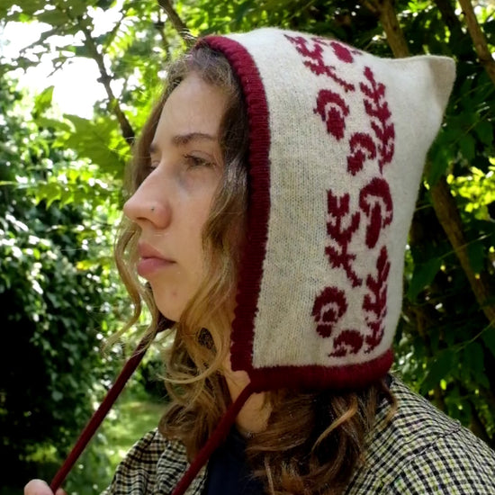 Cashmere Knitted Bonnet - “Toadstool Magic” Pixie Hood in Burgundy and Cream