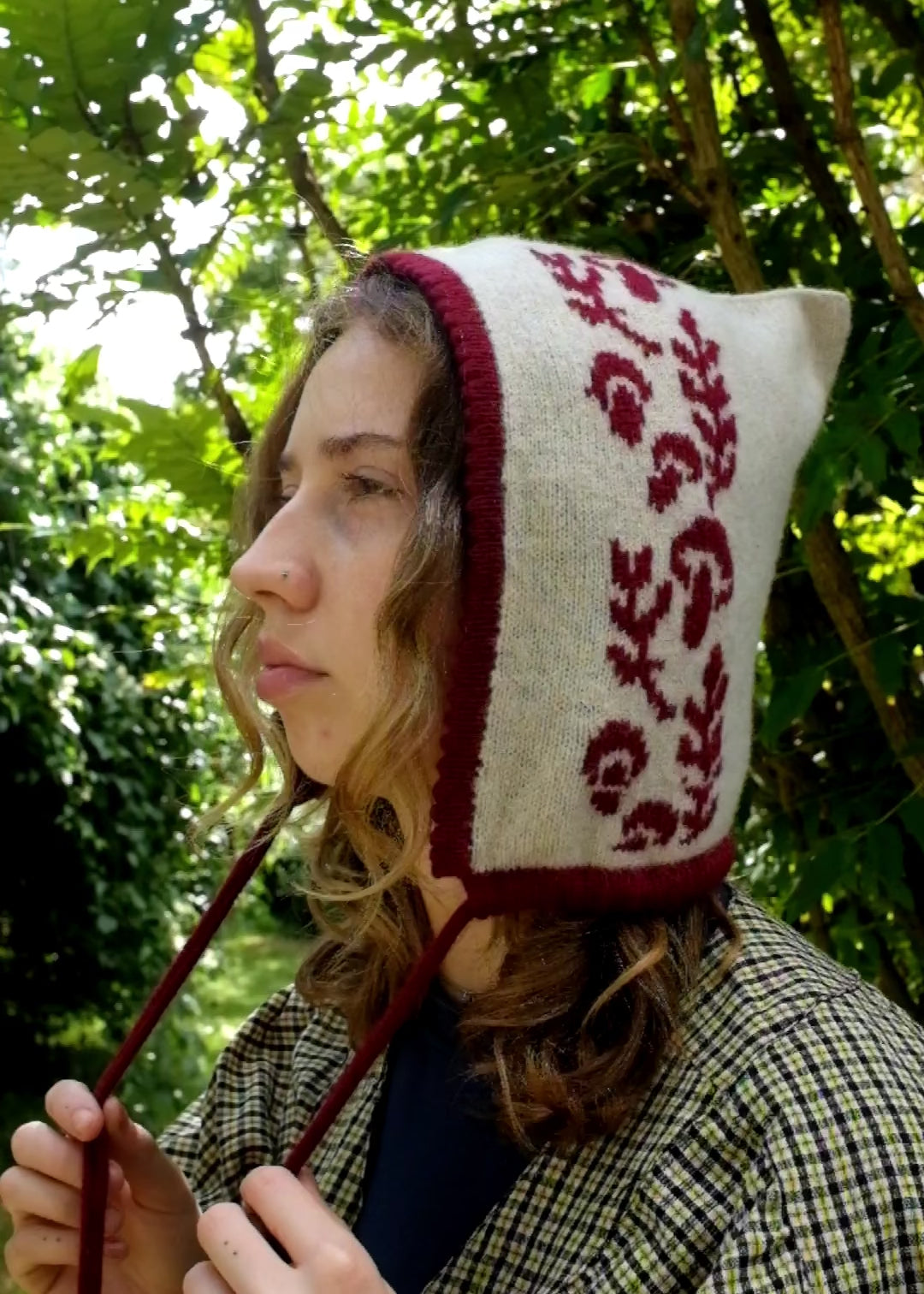 Cottage core “Toadstool Magic”, Cashmere and Lambswool Hand Knitted Sustainable Bonnet.