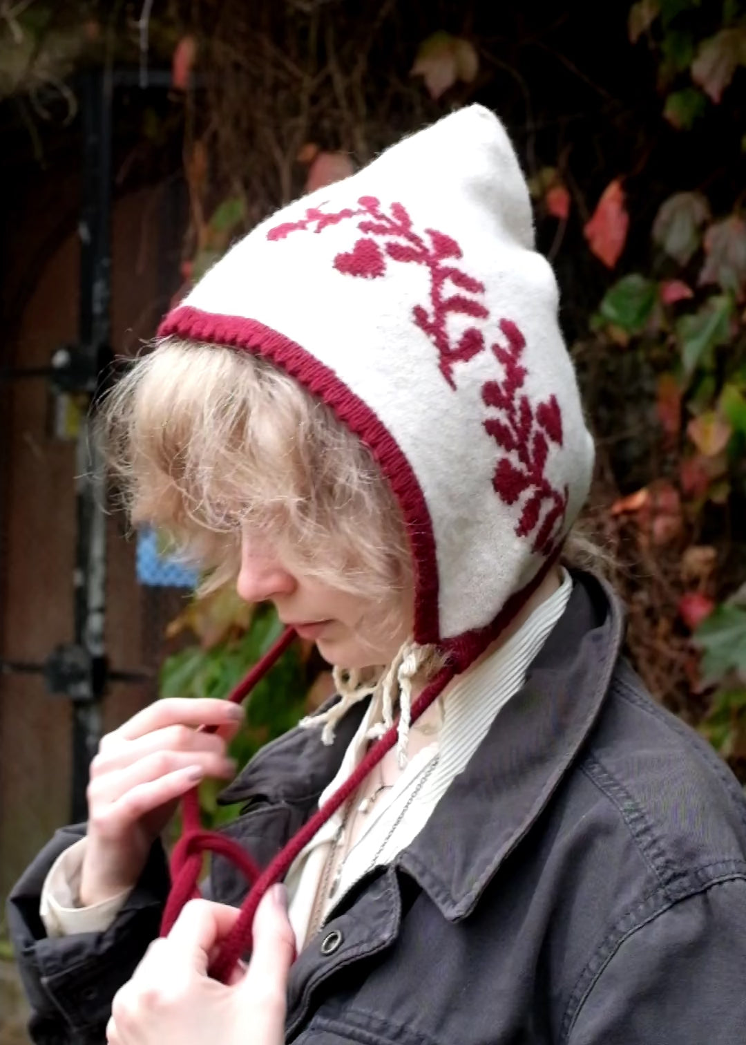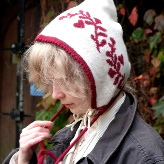 Cashmere Knitted Bonnet - Laurel leaf Pixie Hood in Burgundy and Cream